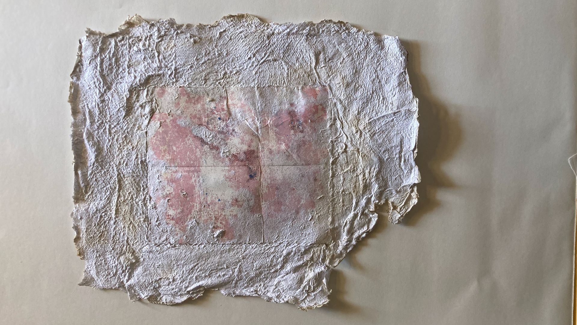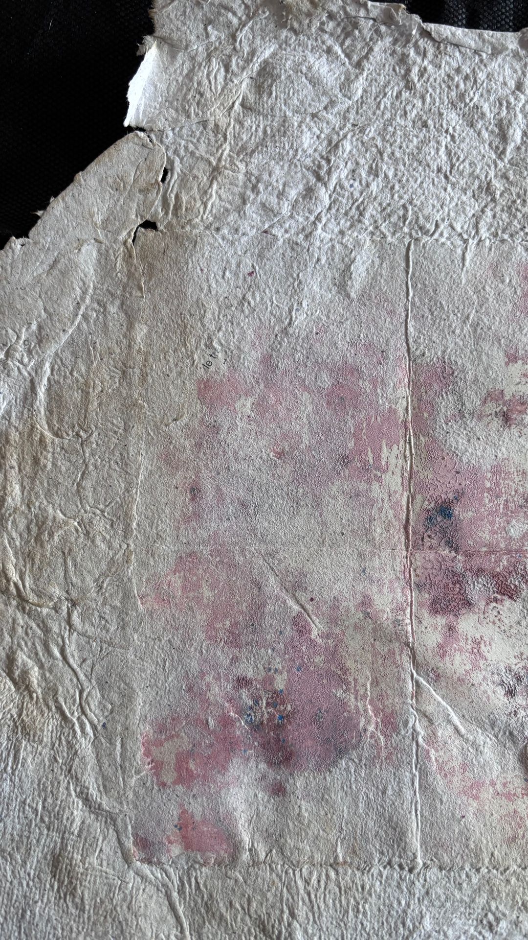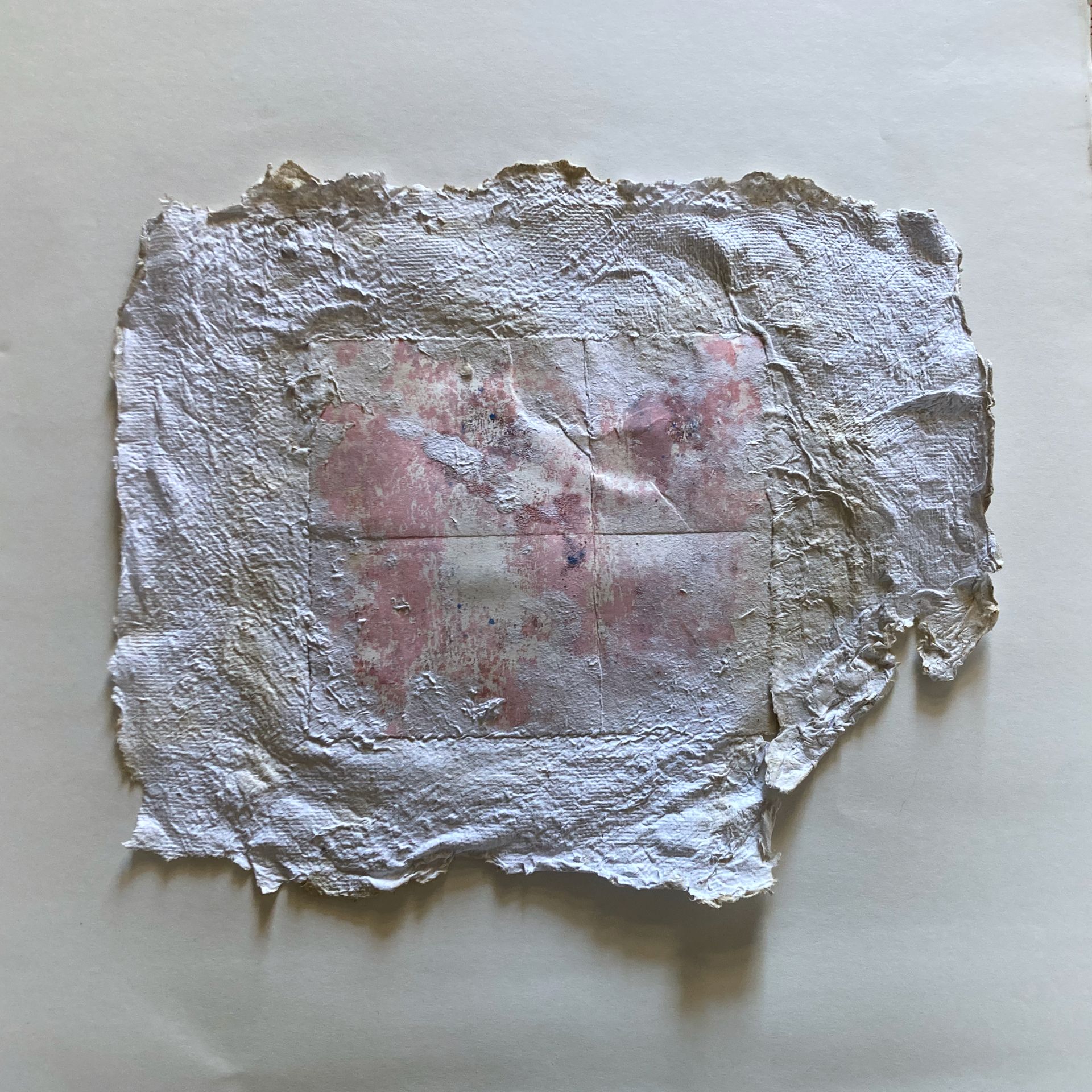 Monotype de 2024 sur papier fondu dans du papier issu des cours de mon fils cadet.