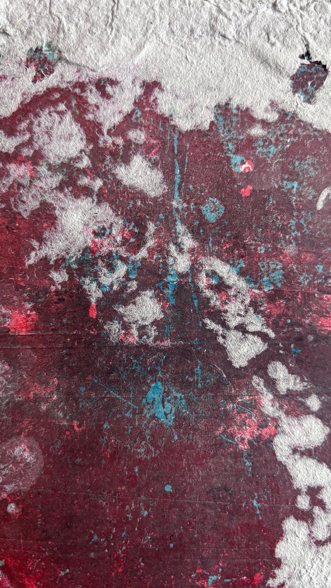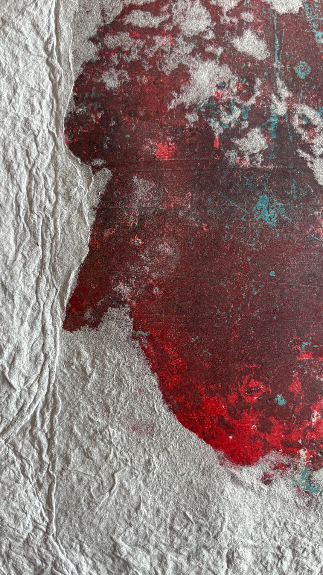 A 2024 monotype on paper blended with paper from my youngest son’s school projects.