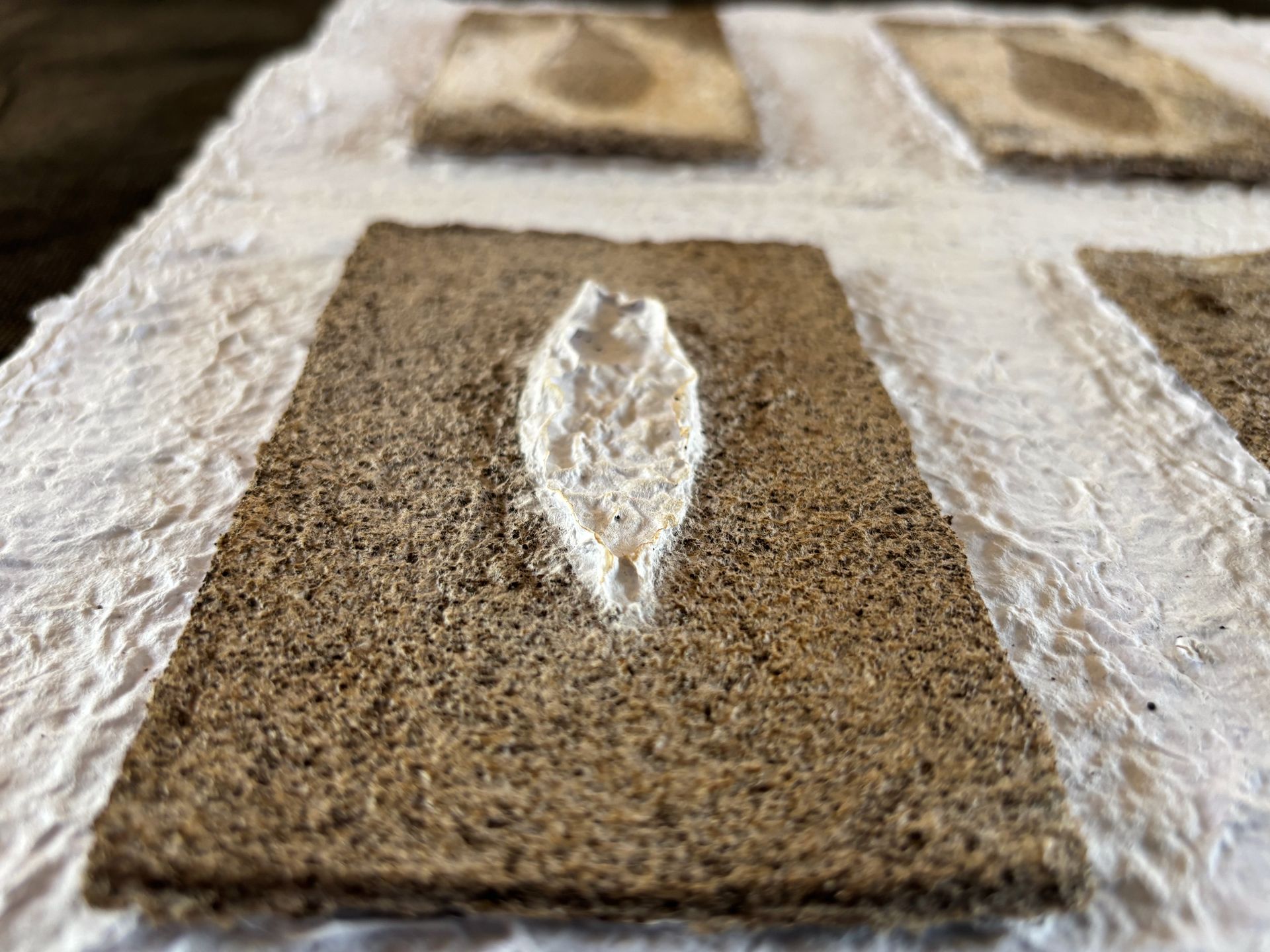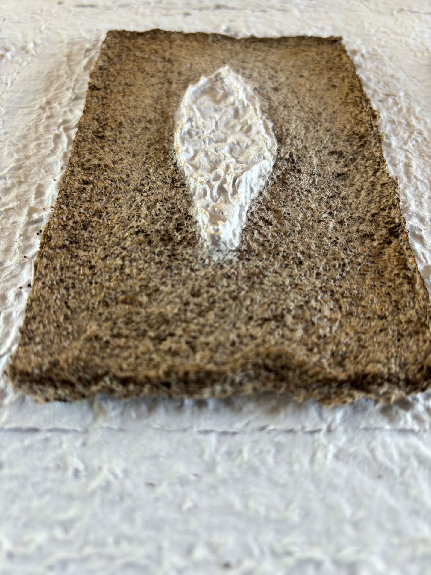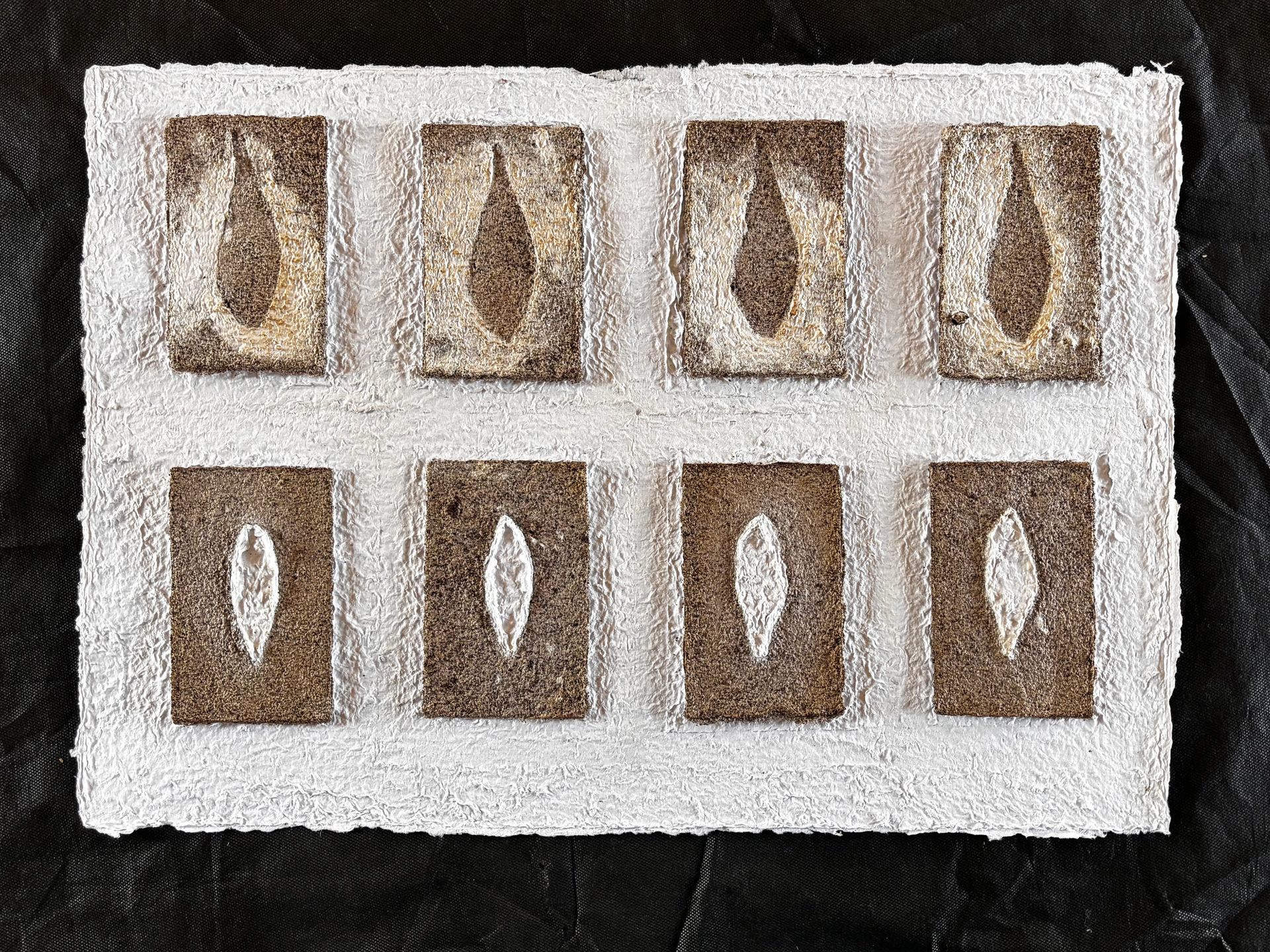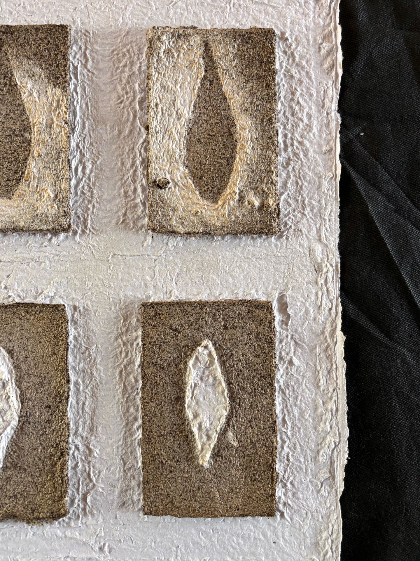 Assemblages de papiers coulés faits de vieux magazines des années 1920 « Noël » trouvés au grenier et abîmés, des cours de mon fils cadet et d’encre rouge coulés dans du papier farci de café.